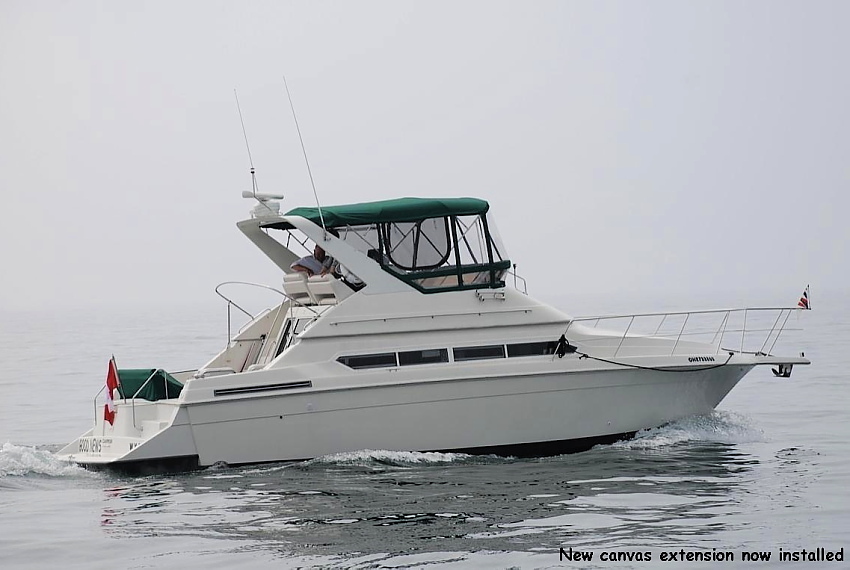 Only 420 Hours * Generator * Heat/Air * Windlass Carver’s 380 Santego has an expansive single-level layout that through popular demand was in production for over 10 years. This 380 Santego is in excellent condition, comes with numerous upgrades and a 2010 survey. Port and starboard molded steps at the swim platform provide seating and excellent access into the cockpit. The cockpit is very spacious, has a built-in bench and full height glass sliding doors into the cabin. The flybridge offers direct access to the foredeck with her convenient walk-thru feature, a new flybridge enclosure, comfortable seating for many with a double-wide helm seat, passenger seat, forward bench and port and starboard lounges. Enter the cabin to large port and starboard wraparound settees with a dining table, a bright and modern galley and a convenient wet bar counter with glass and bottle storage and more cupboard space. The galley is equipped with a NEW full size stainless steel Nova Kool fridge/bottom mount freezer, NEW stainless steel built-in microwave, 2 burner stove and plenty of storage and counter space. The roomy forward stateroom has an island berth, privacy door, 2 closets, drawer space and access to the head. The large head compartment has a separate shower stall and mirrored vanity with plenty of storage.