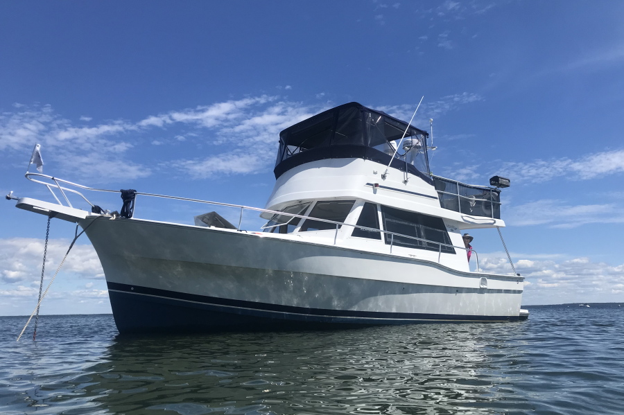 Two Staterooms * Great Fuel Economy * Great Loop Potential The Power Boat Guide says "The Mainship 350 Trawler (called the Mainship 390 in 1999–2005) is a stylish, moderately priced coastal cruiser with classic trawler lines and a good turn of speed. Unlike a true trawler with a full-displacement hull, the 350/390 is built on a faster modified-V hull with flat aft sections and a shallow, full-length keel. She’s a very roomy boat inside thanks to her wide 14-foot, 2-inch beam, and the floorplan manages to include double berths in both staterooms as well as a separate stall shower in the head. (Note that the guest stateroom is partially tucked beneath the galley.) Visibility from the lower helm is excellent, and a deck door provides easy access to the foredeck. Aft, a sliding glass door opens to the covered cockpit where a series of molded steps (instead of a ladder) ascends to the extended fly bridge. Additional features include deep, well-protected side decks, an integral swim platform, transom door, a full teak interior, and a radar/antenna mast." This Mainship 350 has travelled extensively from Florida to Canada and New York to Maine, and is well equipped for safe and reliable coastal cruising. She has been in a Great Lakes freshwater environment since her current owners acquired her in 2022. Bridge canvas and upholstery are in excellent condition, the interior is exceptionally clean and well appointed, and the list of updated and upgraded items shows the level of care this boat has enjoyed over the years, With a single diesel engine and an estimated fuel burn of 2.7 - 4.0 US gallons per hour at a cruising speed of 8 - 10 knots, "Just Breathe" ranks right up there among the most fuel efficient trawlers on the water at approximately 2.5 - 3.0 MPG. Engine hours are getting up there for sure, but it's a good indication of the level of care this boat has received. When properly maintained and not overworked for extended periods, the Caterpillar 3116 can deliver as much as 10,000 hours of service, and many have gone well past that mark. Come have a look for yourself and you'll see what we mean. Maybe it's time to scratch that persistent Great Loop itch! If you are looking for a balance of comfort, range and economy, this Mainship 350 is a strong contender.
