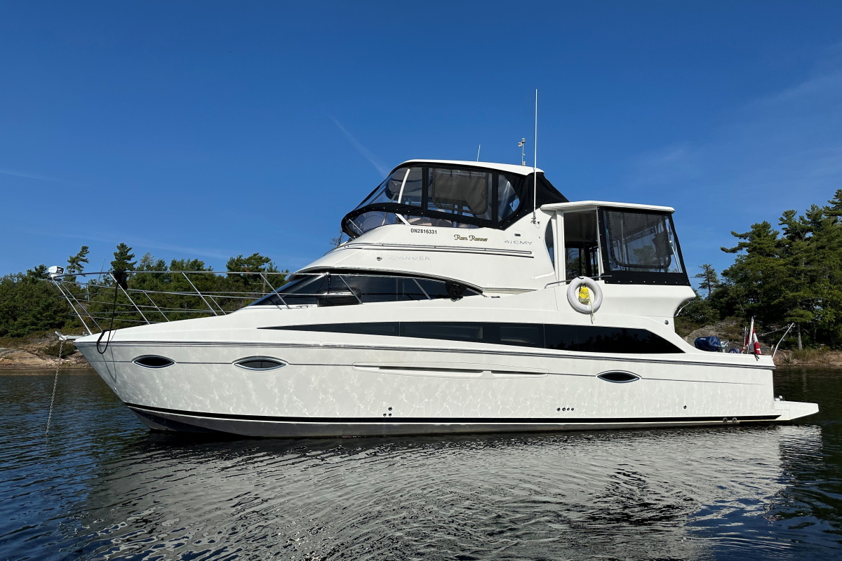 Two Staterooms * Hardtop Bridge and Aft Deck * Bow and Stern Thrusters "Rum Runner" is a low-hour, freshwater cruiser featuring two staterooms, dual hardtops, bow and stern thrusters, and a unique walk-out from the aft cabin to the cockpit. Like all of Carver's mid-range cruiser line, she is built on a solid fiberglass stringer system with solid fiberglass hull bottom with cored topsides and decks. Interior decor features classic cherry wood bulkheads, cabinetry and trim with high gloss finish. Interior and exterior upholstery and finishes are in excellent condition and recently waxed and buffed topsides sparkle like new. Helm visibility is excellent with all new premium quality clear mil windows installed in 2025.